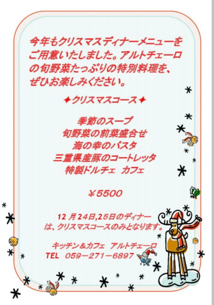 今年もクリスマスディナーメニューをご用意いたしました。旬野菜たっぷりのヘルシーなコースをぜひお楽しみ下さいませ!(12/24.25日のディナーはクリスマス特別メニューのみの受け付けとさせていただきます。2日前までの要予約となります。)